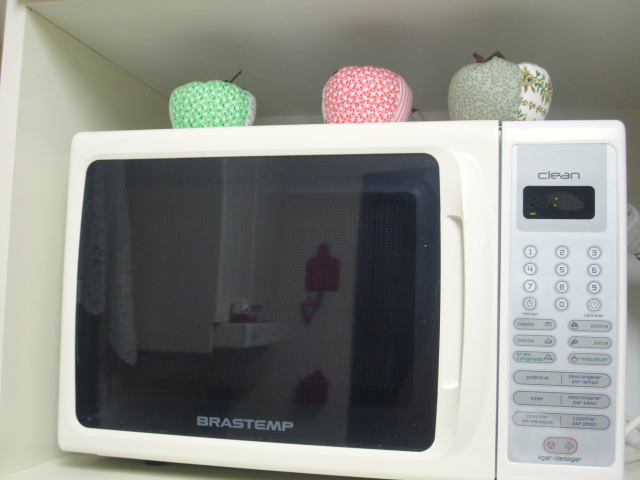 * Minhas maçãs lindas de tecido ( que amoooooo e que ganhei da queridaaaaaa amiga Fernanda do Blog Entrelaçar - vocês conhecem as frutas lindas que ela faz? Visita o blog dela que vc vai se encantar !! )ficaram encima do microondas...