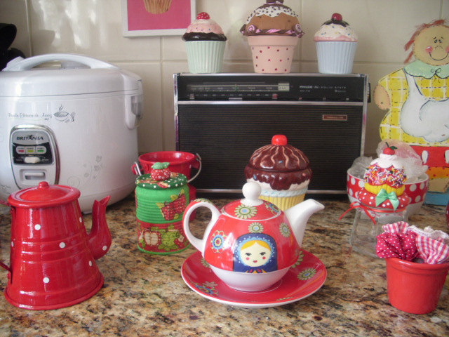 Que coisa mais fofa sua cozinha e todos os seus mimos. amei o seu jogo de xicaras com o bule. De onde é???? quero um também????