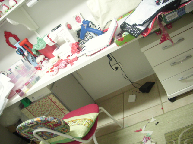 É que além de pintar, minha mesa fica que é só potes de tintas, tbm faço costurinhas... Agora imagina isso tudo junto?!?