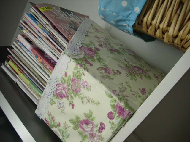 Meu porta revistas de artesanato feito com caixa de papelão e forrado com tecidinho....( aprendi com a Fernanda Reali ! - AQUI )