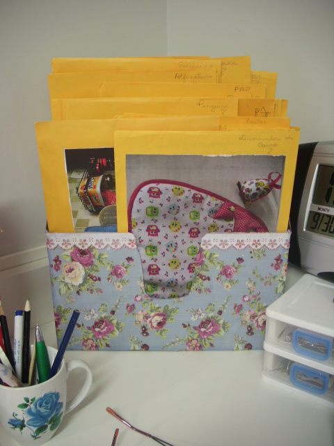 Agora todos acoplados num porta papel ( destes comprados em livraria - eu forrei com um tecidinho fofo pra deixar tudo lindo, né? rsrsrsrsrs)